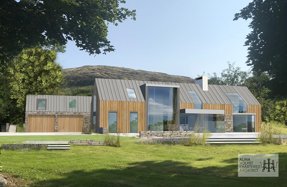 Creative renovation & transformation scheme of a dwelling in one of the most desired countryside areas of Rostrevor. For private, professional Clients. The existing house and its adjacent garage/workshop have been carefully & sustainably remodelled to take advantage of the outstanding views and raised topography of the site and to sustain mature landscaping that offers exceptional privacy while respecting relevant policies, particularly the strict requirements of the AONB (Area of Outstanding Beauty).