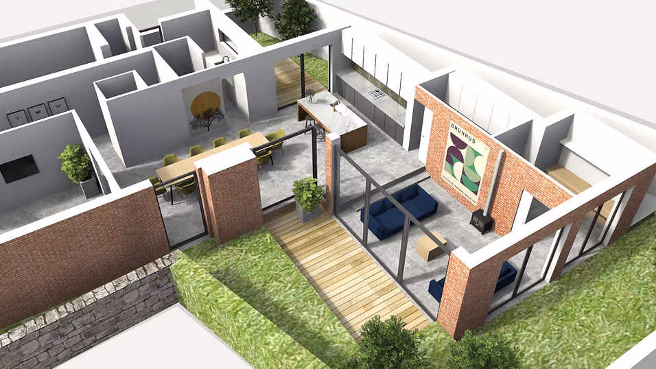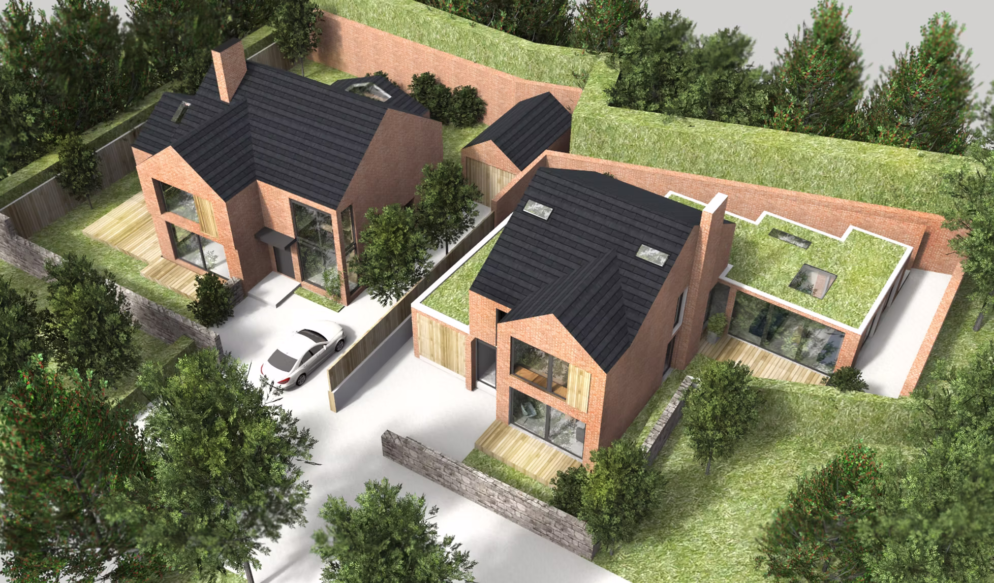 A challenging scheme on an elevated site in a tense suburban setting in west Belfast. The design has been carefully considered to maximise the use of existing topography and geology of the site to offer privacy and a split -level arrangement. The split level concept is also a reference to the design conscious Clients to reflect their passion for mid-century interiors. The materials, massing, scale and finishes reference red brick Victorian houses of the surrounding area.